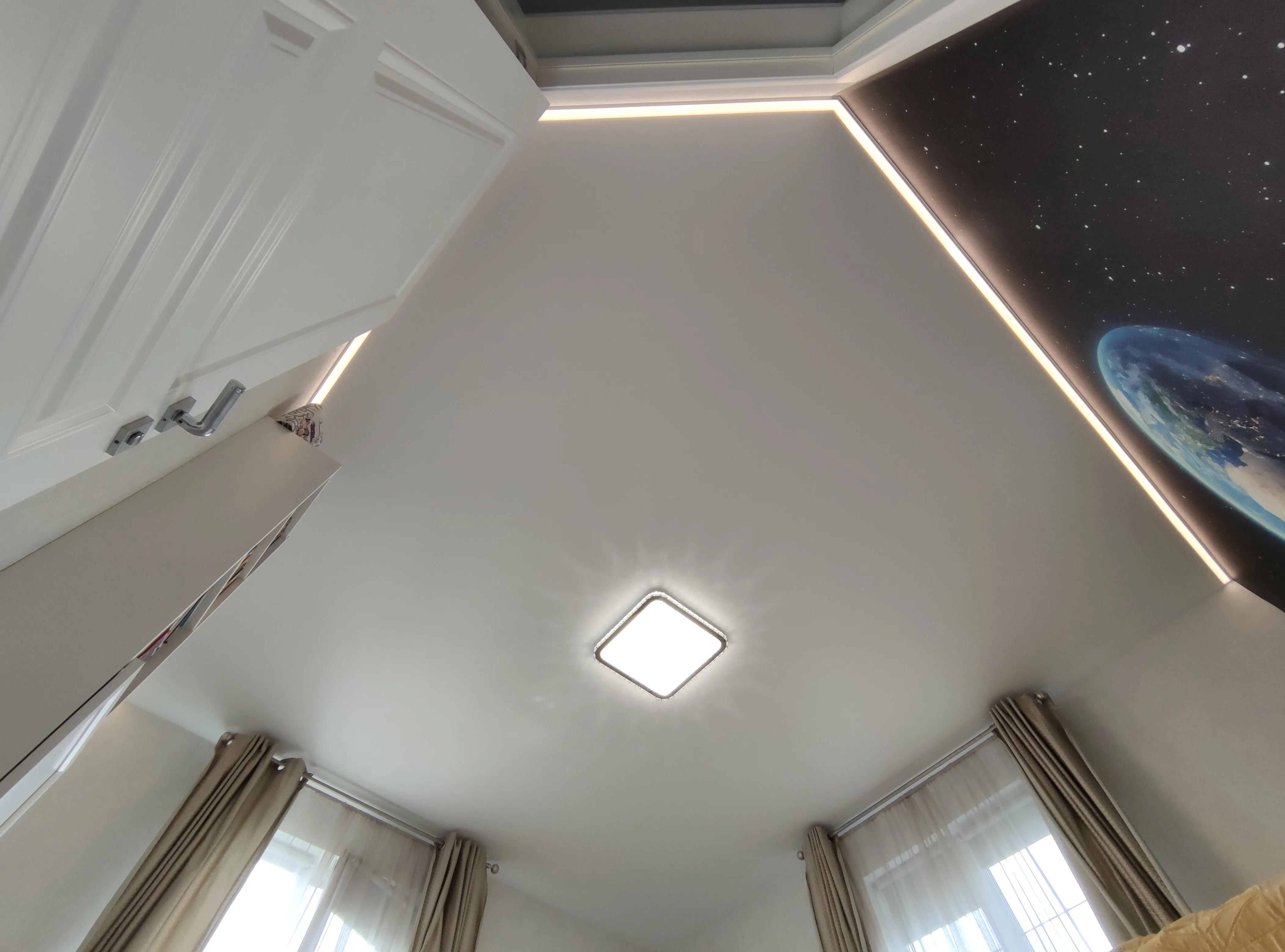 Натяжной потолок с контурной подсветкой — оригинальное решение для спален и гостиных. Они создают красивый световой эффект и уютную, спокойную атмосферу. Заказать потолочную систему с подсветкой по периметру комнаты в Рузе по доступной цене можно в нашей компании «Седьмое небо».