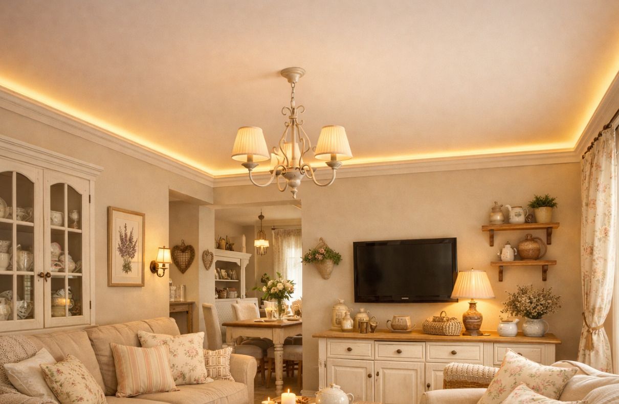 • Мат бежевый + тёплая подсветка по периметру + прованс: домашний уют, мягкие тени.